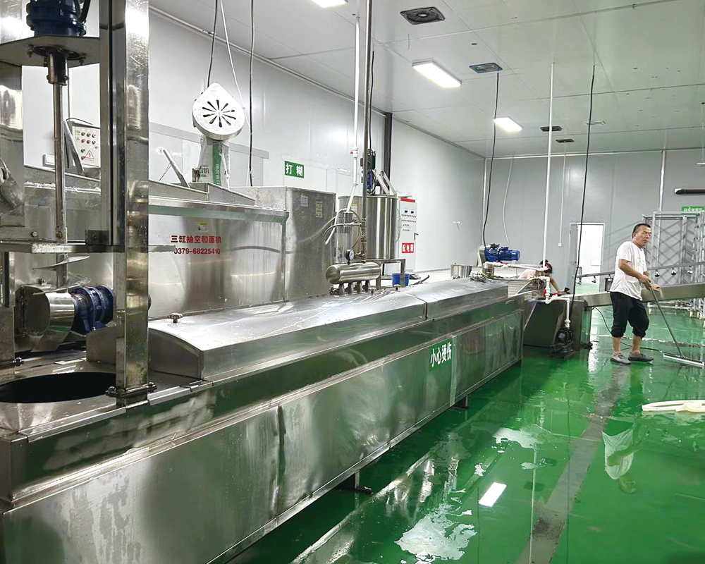 自动上料→打芡→和面→抽真空→旋叶震动下瓢→链条传动蒸煮→传送冷却→切条拨粉→常温老化→冷冻散粉→干燥包装